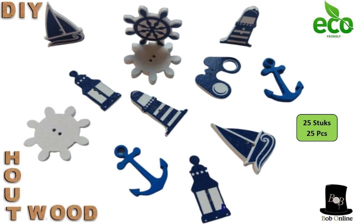 Bob Online ™ – 25 Stuks – Mixed Setje – Knoop – Houten Geschilderd Maritiem Vormige Knopen met 2 Gaatjes – Anker, Zeilboot, Vuurtoren, Verrekijker, scheepswiel + Lantaarn versieringen – Knutselen, Naaien, Scrapbooking, Accessoires, Kaarten Maken